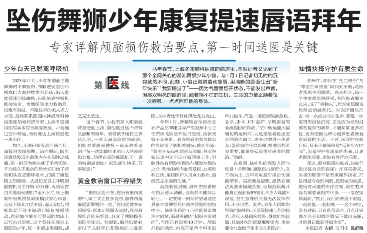 新民晚报半版报道潮汕舞狮少年小翁的康复进展。小翁现已在冬雷脑科接受治疗两个月,康复进度超预期。治疗期间,高亮院长还意外发现小翁体内存在假性动脉瘤,第一时间为他完成了手术切除,并为经久不愈合的后枕切口做了清创和头皮皮瓣移植术,扫清了康复路上的障碍。从最初无自主呼吸到能脱机自主呼吸10分钟,到现在白天能顺利脱机7至8小时,晚上借助呼吸机脱机训练模式安心休息;从双下肢肌力为0级、毫无知觉,到能借助下肢主被动训练仪慢慢活动,再到如今能在可竖起的病床上进行站立训练,这个曾经在高桩上腾跃的少年,每一步都走得艰难,却又无比坚定。